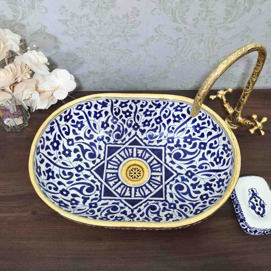 Blue Hand-painted Moroccan Sink With Elegance Brass Rim