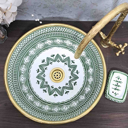 Green sink bowl - Moroccan painted ceramic sink with brass rim