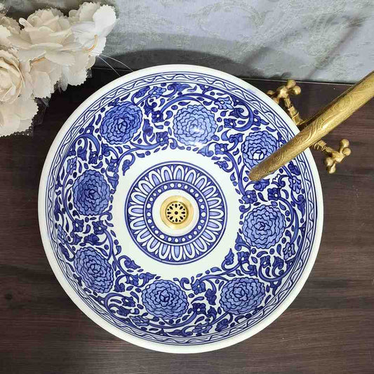 Blue floral Moroccan sink bowl with brass rim -countertop sink bathroom